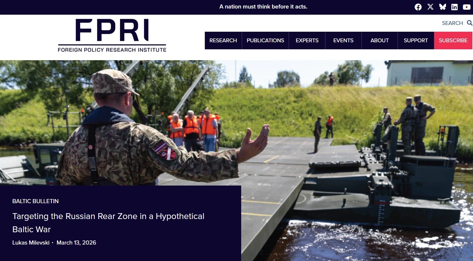 1. 13 марта 2026 г. доцент Лейденского университета Лукаш Милевский (американо-латышское гражданство у него) опубликовал на сайте американского аналитического центра Foreign Policy Research Institute материал под названием «Targeting the Russian Rear Zone in a Hypothetical Baltic War» с неким обзором того, а куда следовало бы вдарить на глубину до 50 км, чтобы затормозить гипотетическое продвижение российских войск на страны Балтии.