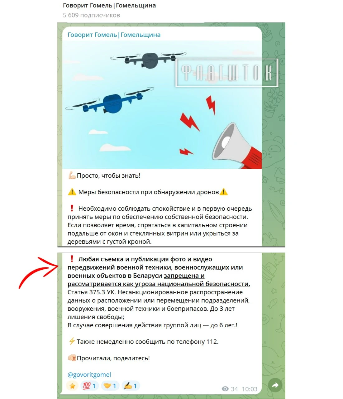 Тем временем телеграм-канал управления идеологии Гомельского облисполкома уже грозит гомельчанам уголовной ответственностью за съемку дрона.