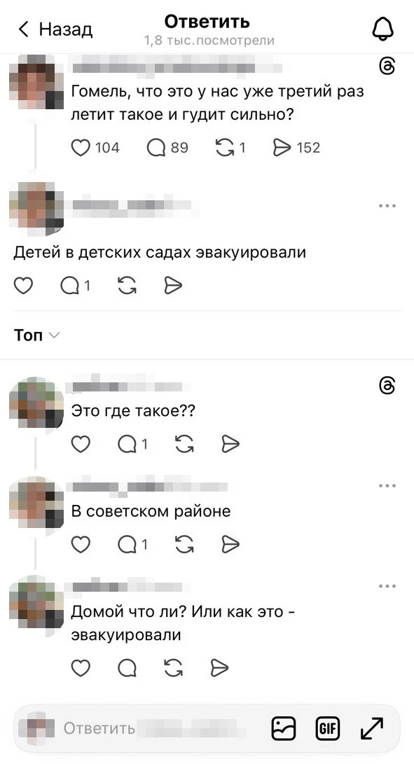 В Тредс гомельчане обсуждают пролет дрона. Пишут, что в Советском районе эвакуировали детские сады.